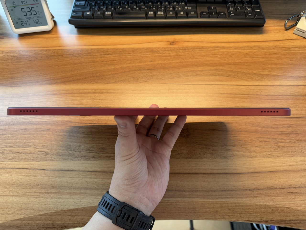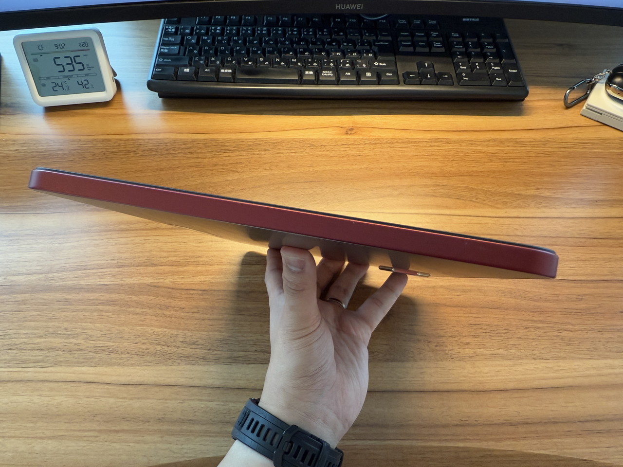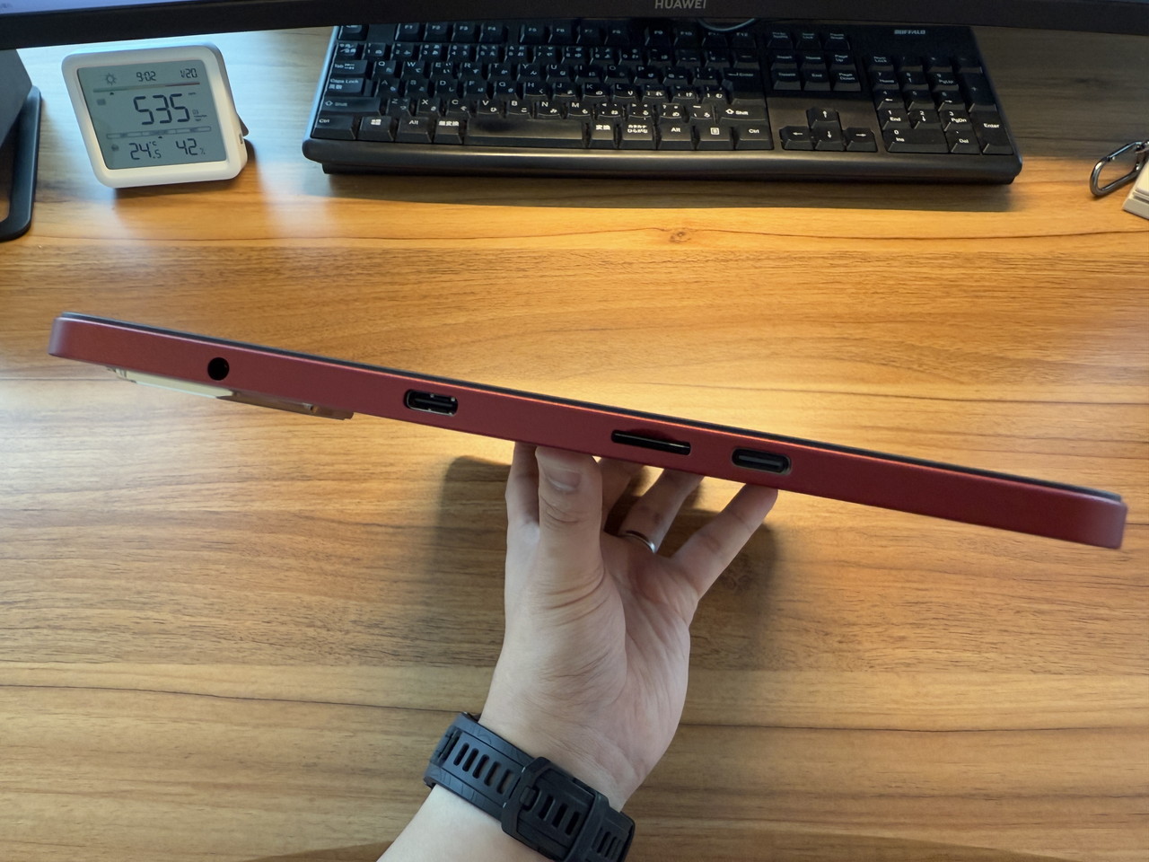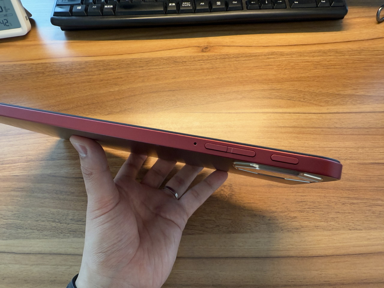 厚み8mm、約620gのややズッシリ感のある筐体は、チェリーレッド色のメタルボディで包まれており、高級感が感じられるデザインだ。