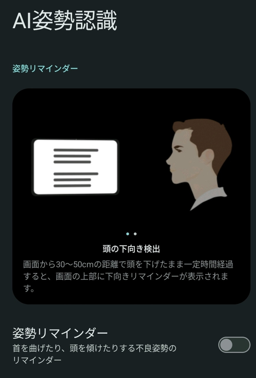 「AI姿勢認識」は、タブレット使用時のユーザーの姿勢を正すための機能だ。