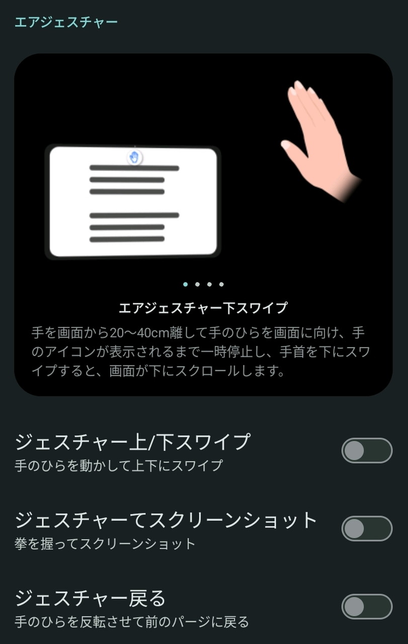 設定から「エアジェスチャー」をオンにすることで、タブレット画面に手のひらを向けて、手首を上下にスワイプしたり、裏返したり、握ったりすることで、画面スクロールやスクリーンショット撮影などを機能を利用できる。