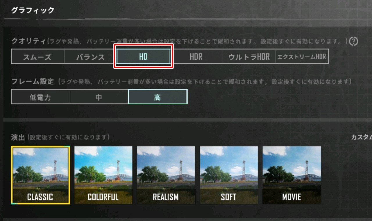まずグラフィッククオリティに関しては『HD』まで選択できた。