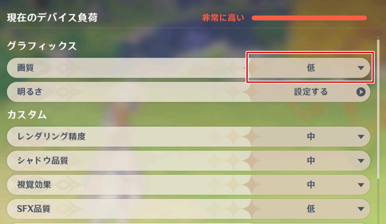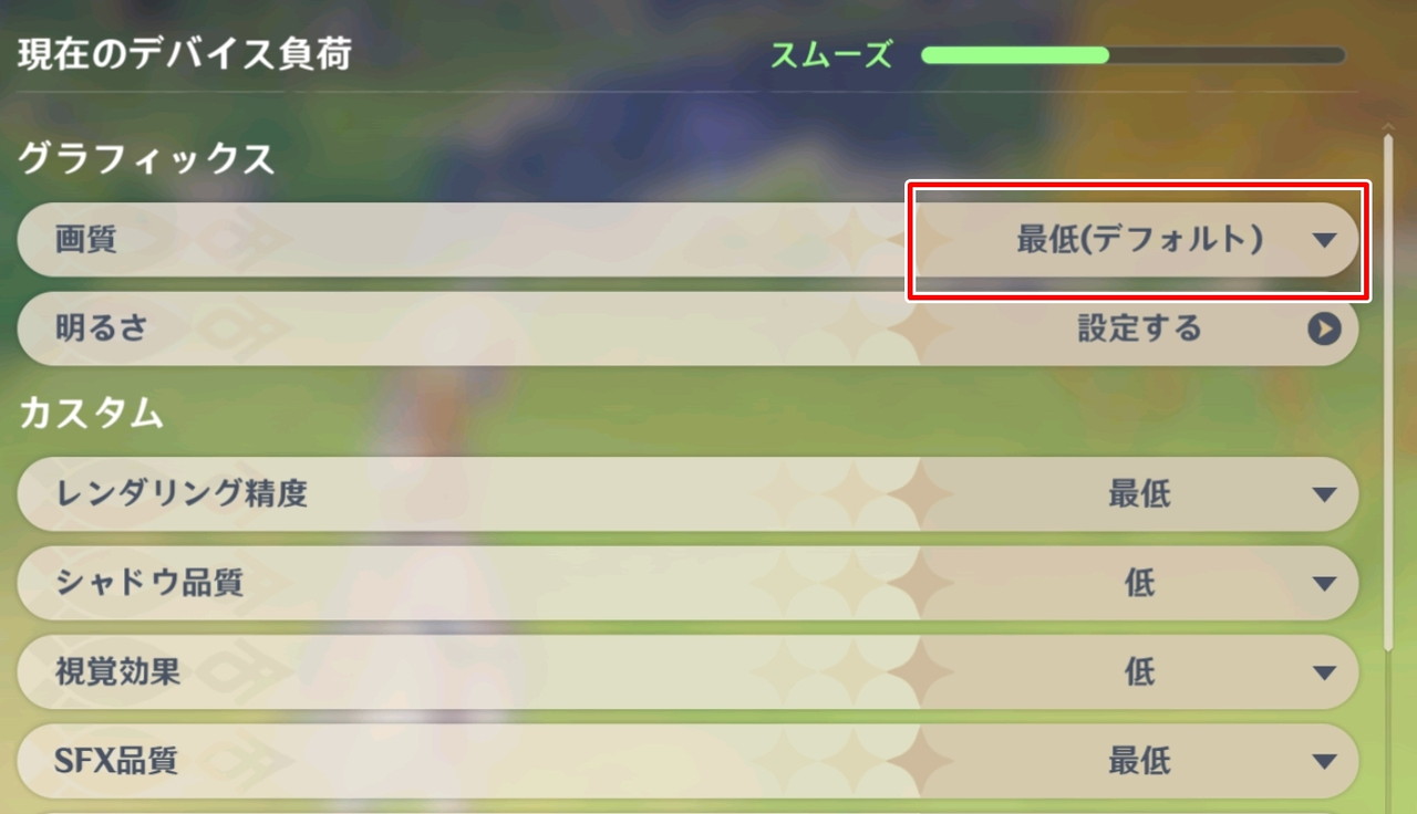 ▼画質設定はデフォルト状態で "最低" に設定されており、デバイス負荷は "スムーズ" の状態。
