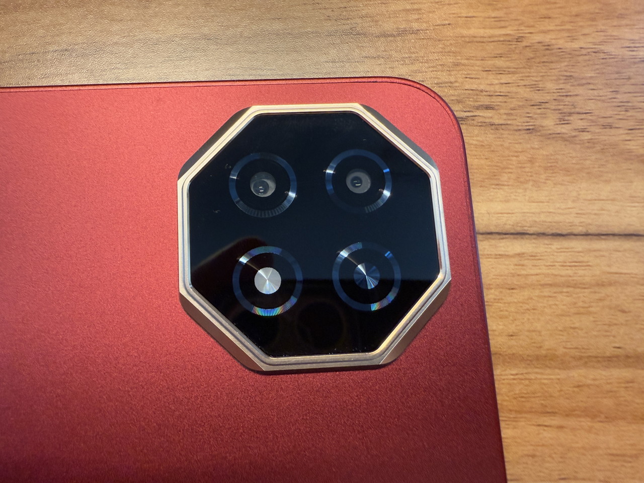 ▼チェリーレッド色の筐体背面からは鈍い光沢が見られ、そこそこの高級感がある。手触りもサラサラもサラサラと心地よいが、手脂などの汚れが若干目立つ。