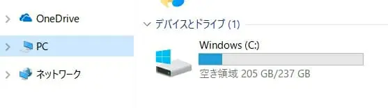 ▼本体ストレージは、デフォルト状態で約237GB分が利用可能領域となっている。