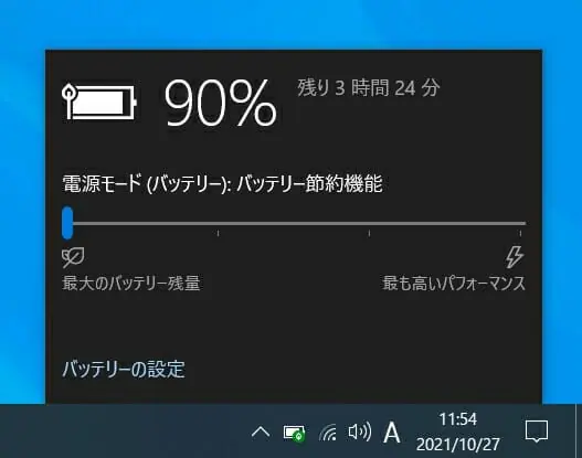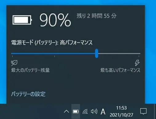▼電源モードを高パフォーマンスに設定した場合。90%の充電残量を約3時間で消耗する。