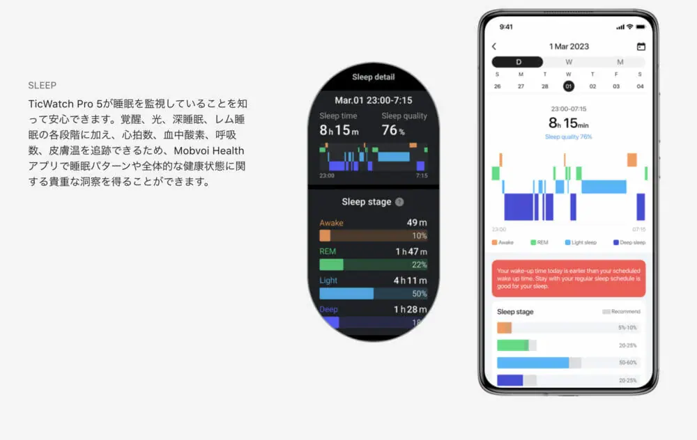 起床、浅い睡眠、深い睡眠、レム睡眠の各睡眠段階をトラッキング可能。さらに、心拍数、血中酸素レベル、呼吸率、肌温を追跡し、Mobvoi Healthアプリで睡眠パターンと全体的な健康状態を視覚的に管理できる。