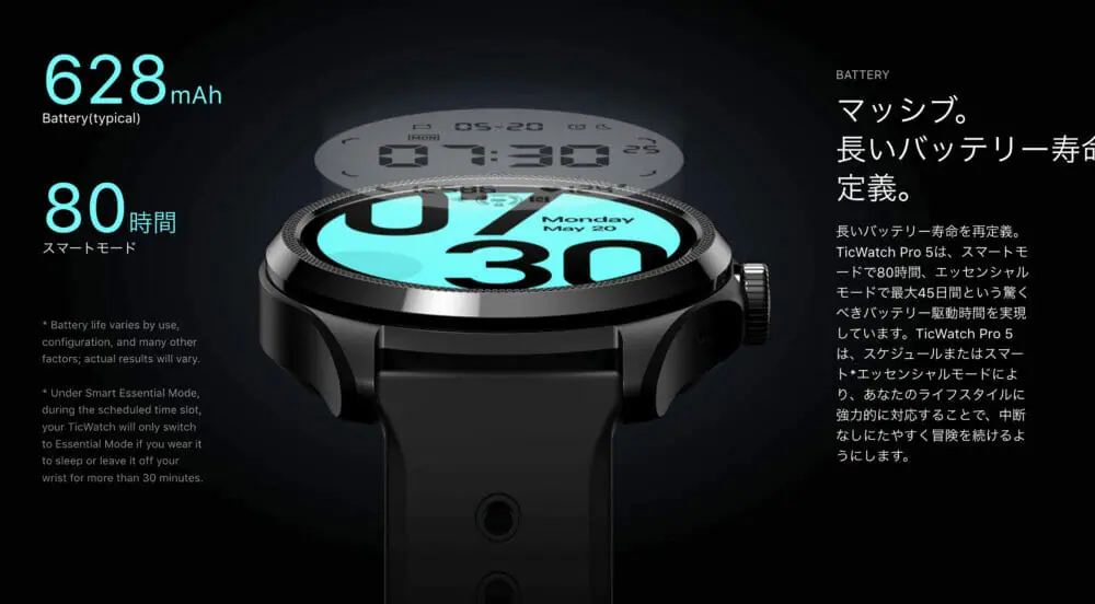 大容量バッテリーを備え、スマートモードならば80時間連続で駆動できる。最低限のモード(エッセンシャルモード)ならばなんと45日間の持続が可能となっている。