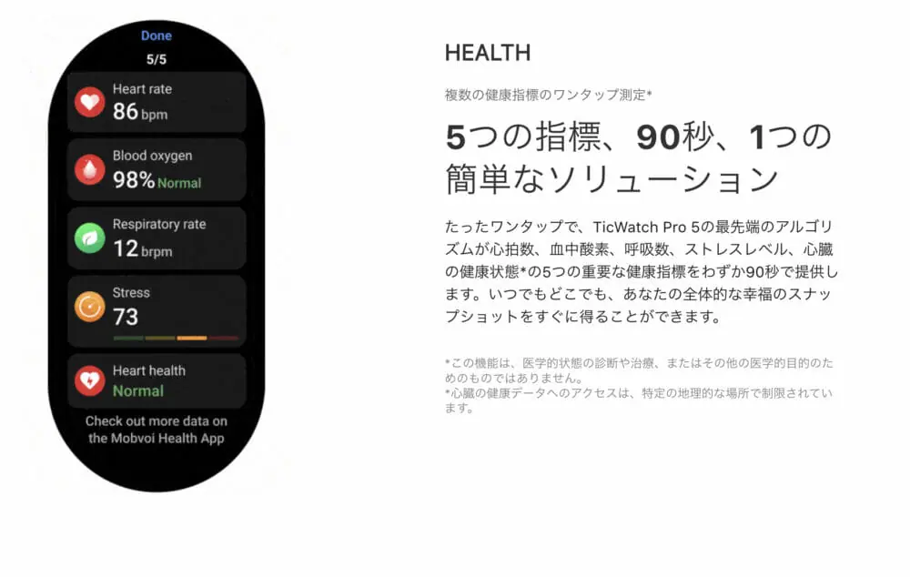 心拍数、血中酸素レベル、呼吸率、ストレスレベル、心の健康などを、一度のタップ(90秒)で測定できる。