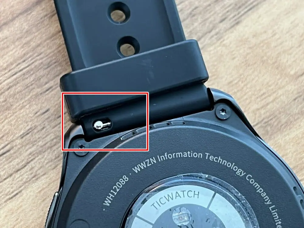 充電の際は、スマートウォッチ背面のポートにケーブル端子を近づけるだけでカチッと磁石で吸着し、充電が開始される。