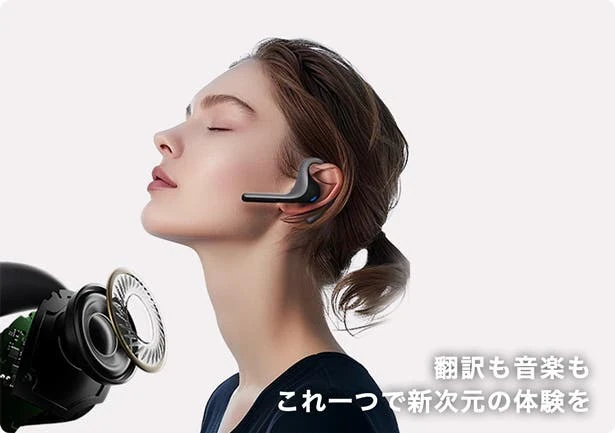 本製品は40の言語と93のアクセントを95%の高精度でリアルタイム翻訳可能。付属する2つのオープンイヤー型イヤホンを相手とシェアすることで、瞬時に翻訳を開始。スマホやイヤホンの操作も不要なため、スムーズな異言語コミュニケーションを実現できる。