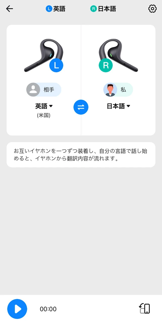 このモードでも、両方もしくは片方のイヤホンを自分だけ装着し、アプリ上で翻訳言語を指定する。