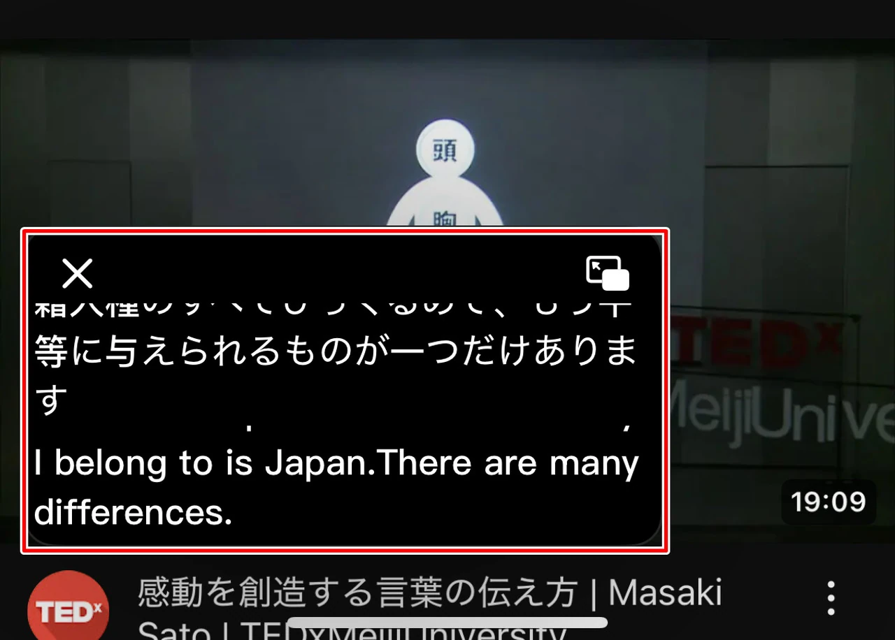 すると画面上にフローティングウィンドウが表示され、動画音声の元言語・翻訳テキストがリアルタイムに表示される。