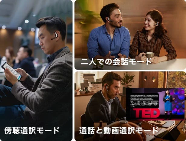 2人での会話翻訳モードに加え、傍聴通訳モード、通話&動画通訳モードなど、様々なシーンに適した翻訳モードを搭載。スマホで再生している動画の音声をリアルタイム翻訳しながら視聴することも可能だ。