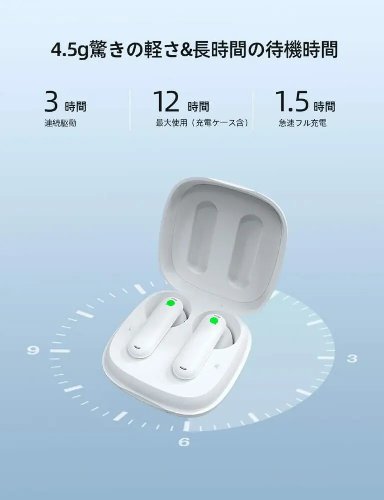 | 稼働時間 | イヤホン単体:約3時間 充電ケースあり:約12時間 |