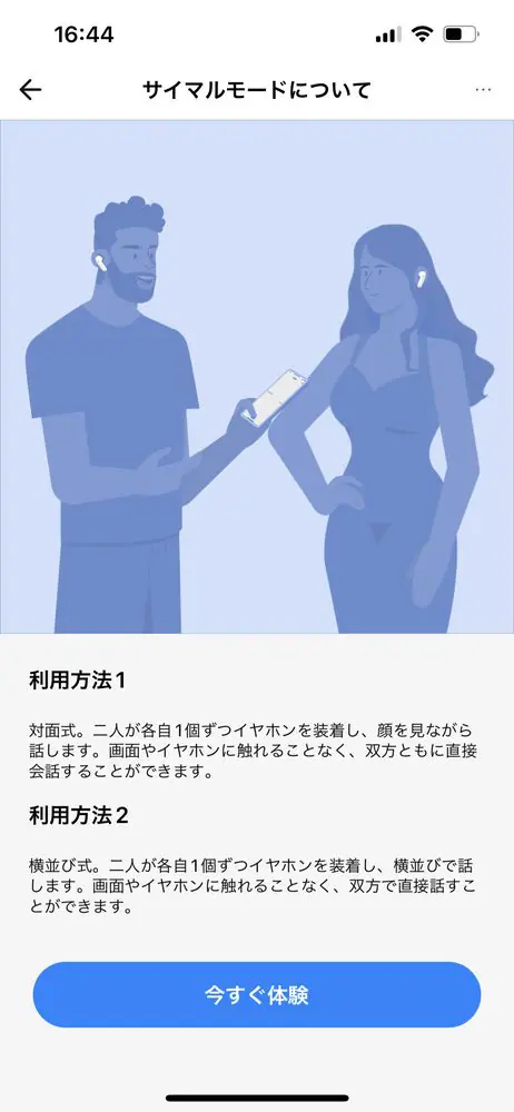 「サイマル(同時通訳)モード」とは、話者2人が各自1つずつイヤホンを装着し、双方で直接会話を行うことのできるモードだ。