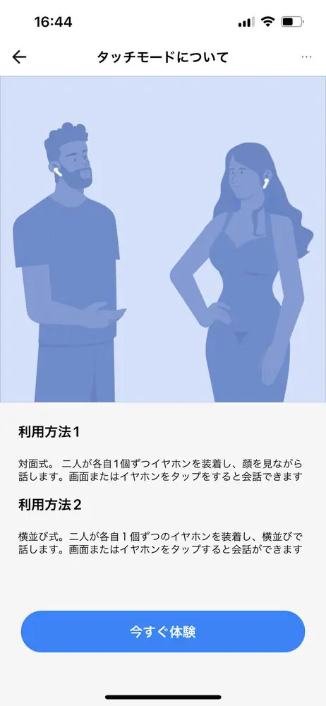 「タッチモード」は、イヤホン側面、もしくはアプリ画面をタッチして話すと翻訳してくれるモードだ。話したい(翻訳したい)内容を確実に翻訳してくれるため、こちらも双方向の会話に適している。