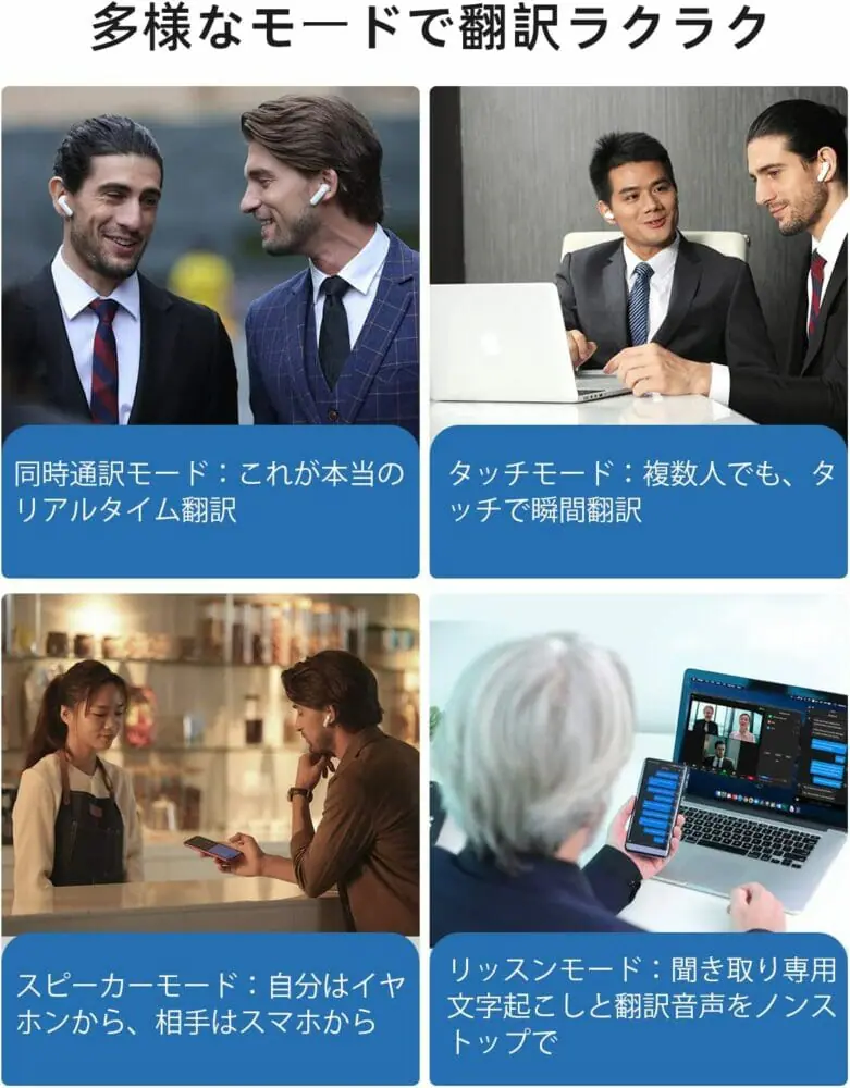 双方向でリアルタイム翻訳ができる「同時通訳モード」、タッチ操作で翻訳したい内容だけを翻訳できる「タッチモード」、相手がイヤホンを付けなくても会話できる「スピーカーモード」、音声を聞き取りノンストップで文字起こしと翻訳を行う「リッスンモード」など、利用シーンに応じた4つの通訳モードが用意されている。