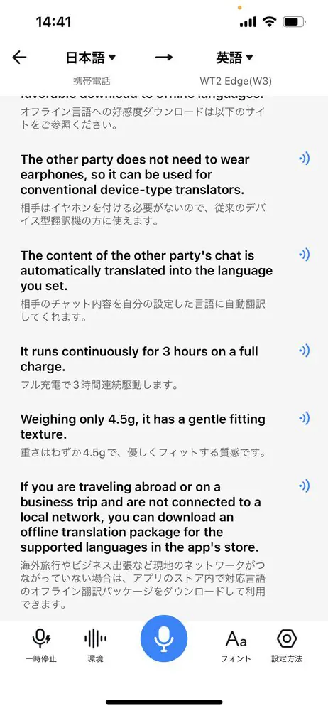 本製品最大の特徴は、ハンズフリーかつリアルタイムでの双方向同時通訳が可能な点だろう。一般的な翻訳機では、一度に話せるのは一人だけで、もう一方は相手が話し終わるのを待つ必要がある。しかしWT2 Edgeでは双方向でリアルタイムに通訳することが可能なため、会話の速度と効率が大幅に向上する。