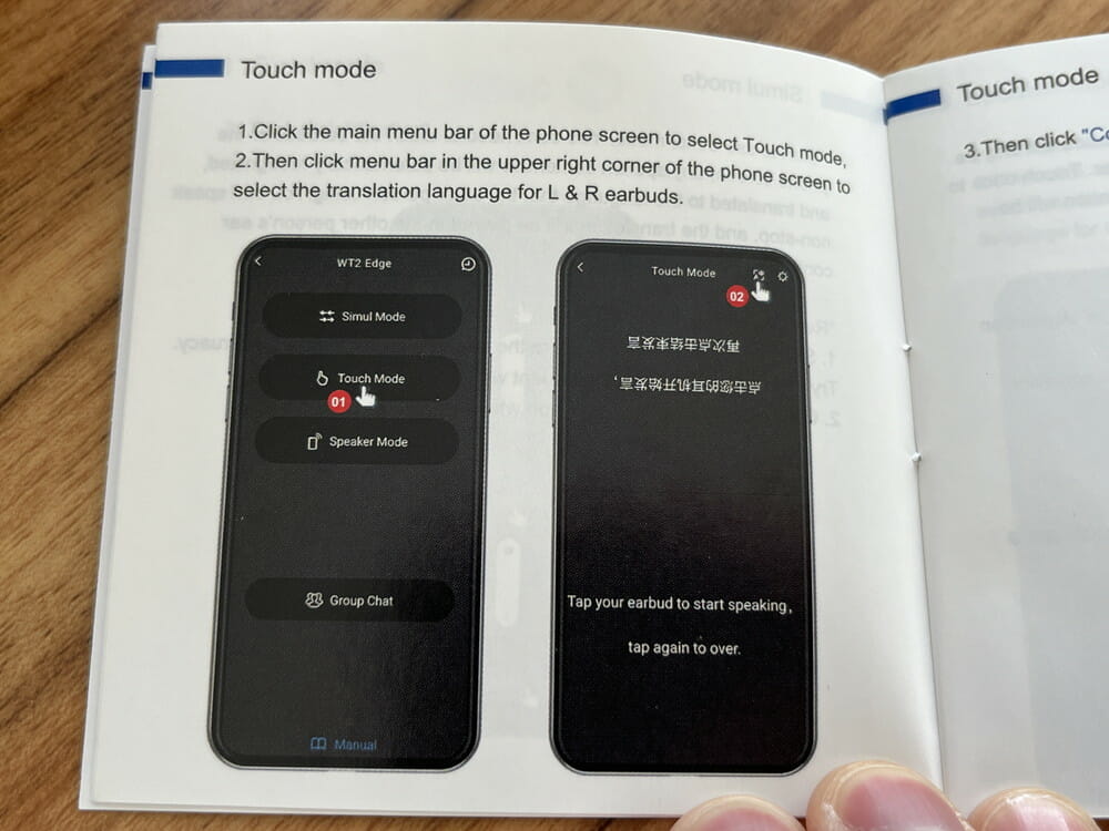 「タッチモード」は、イヤホン側面、もしくはアプリ画面をタッチして話すと翻訳してくれるモードだ。話したい(翻訳したい)内容を確実に翻訳してくれるため、こちらも双方向の会話に適している。