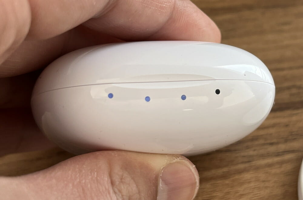 ▼イヤホンが内蔵された状態でフタを閉めると、インジケータが点灯してバッテリー残量を示す。ただ、インジケータの点灯が弱めで見づらい点が気になった。