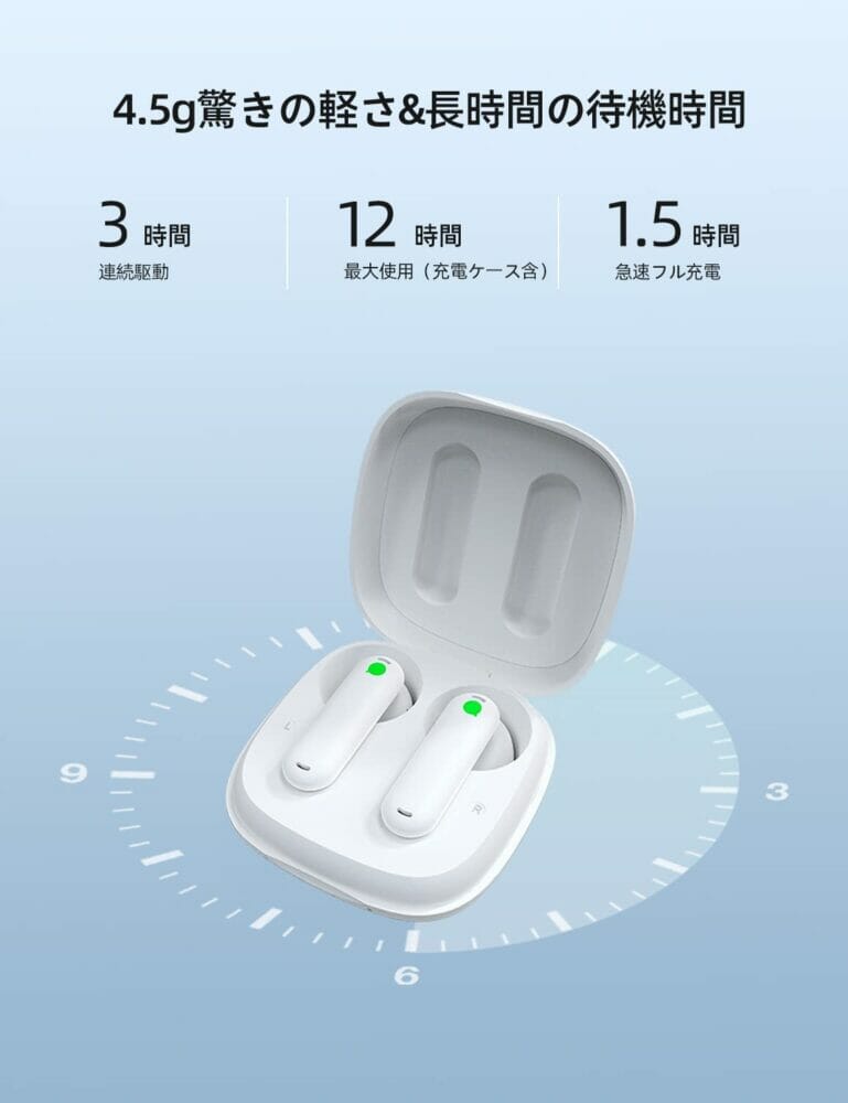 | 稼働時間 | イヤホン単体:約3時間 充電ケースあり:約12時間 |