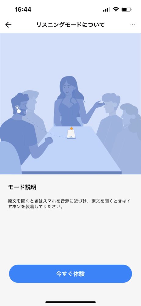「リスニングモード」は、聞き取り専用モードだ。スマートフォンに向かって話してもらうことで、画面上には文字起こし、イヤホンには翻訳音声がノンストップで流れる。