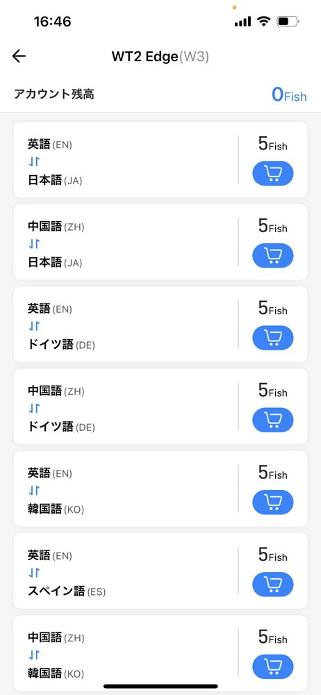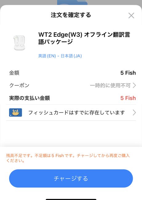 ▼オフライン翻訳言語パッケージの購入には、"Fish" と呼ばれる特殊なポイントを利用する。