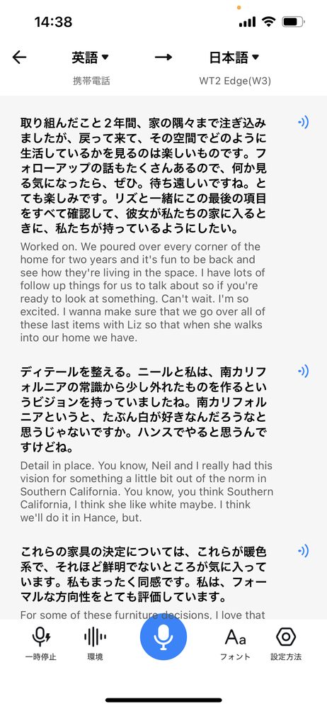 もちろん、サイマル(同時翻訳)モードを使用した同時翻訳の精度も高く、十分に自然な会話を楽しむことが出来た。翻訳のタイムラグがほぼなくリアルタイムで途切れることなく翻訳できる点は素晴らしい。