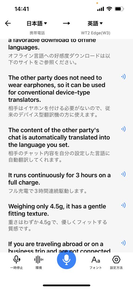 本製品最大の特徴は、ハンズフリーかつリアルタイムでの双方向同時通訳が可能な点だろう。一般的な翻訳機では、一度に話せるのは一人だけで、もう一方は相手が話し終わるのを待つ必要がある。しかしWT2 Edgeでは双方向でリアルタイムに通訳することが可能なため、会話の速度と効率が大幅に向上する。