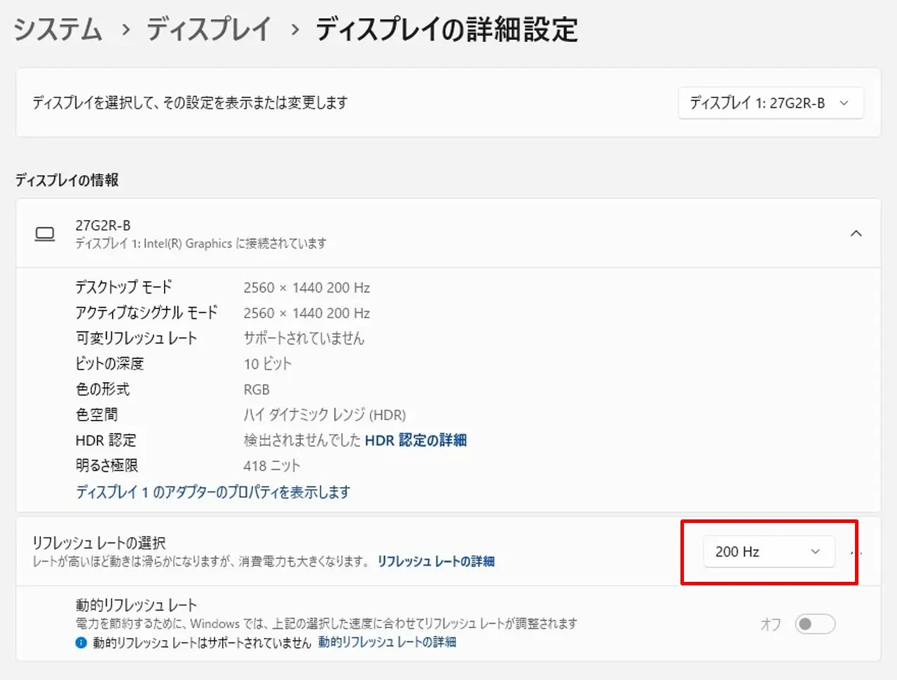 ▼ディスプレイの表示情報。200Hzリフレッシュレートに対応。