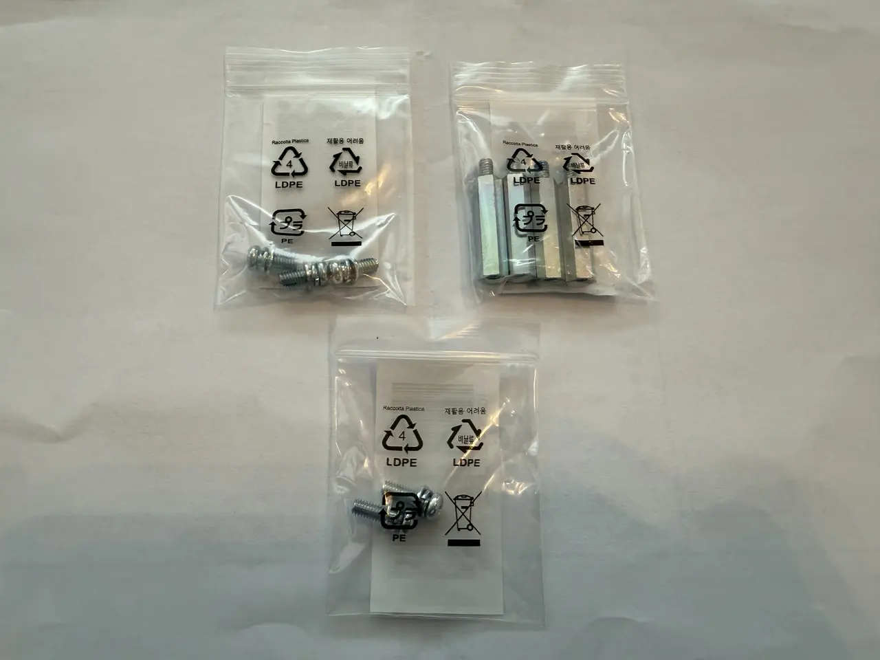 ▼スタンド&ベースを組み立てるための取付ネジと、マウント接続用のネジが付属。取付ネジには1本ずつ予備が含まれている。