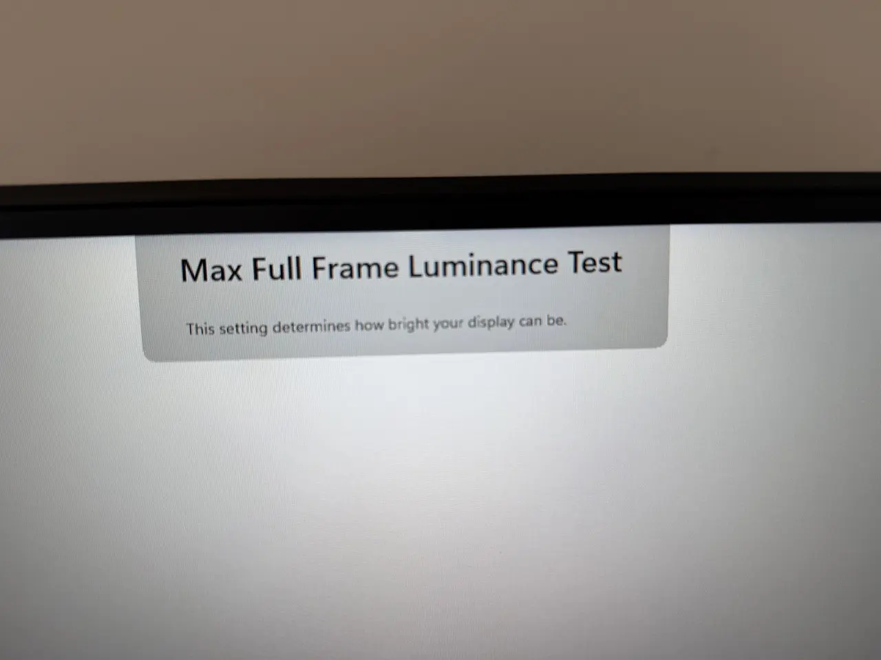 ▼「Windows HDR Calibration」を用いて、Max Full Frame Luminance test (フルフレーム最大輝度テスト) ・HDRオン時の画面を測定。