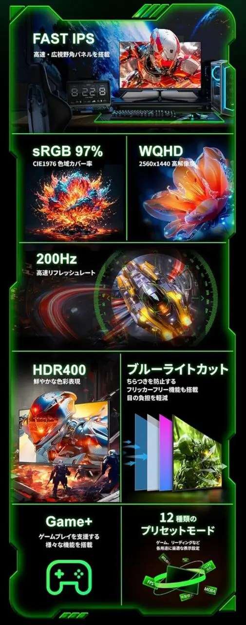 以上の通り、WQHD解像度×FAST IPSパネル×最大200Hzリフレッシュレートにより、日常使いから本格的なゲーミングまで、幅広い用途に対応できる高機能モニターとなっている。