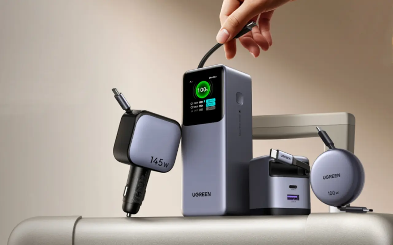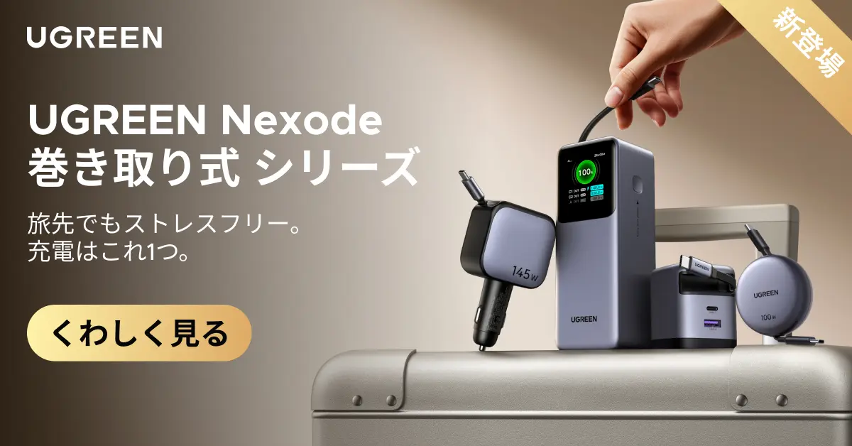 『UGREEN Nexode 巻き取り式100W充電器』は、75cmの伸縮式USB-Cケーブルを内蔵し、絡まずスマートに持ち運べる高耐久設計。