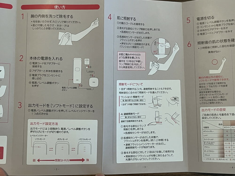 とにかく扱い方がシンプルで簡単。丁寧な説明書も付属しており、何ら困ることなく脱毛を行うことができました。この手の脱毛器を初めて手にする方でも、安心して使用できるでしょう。