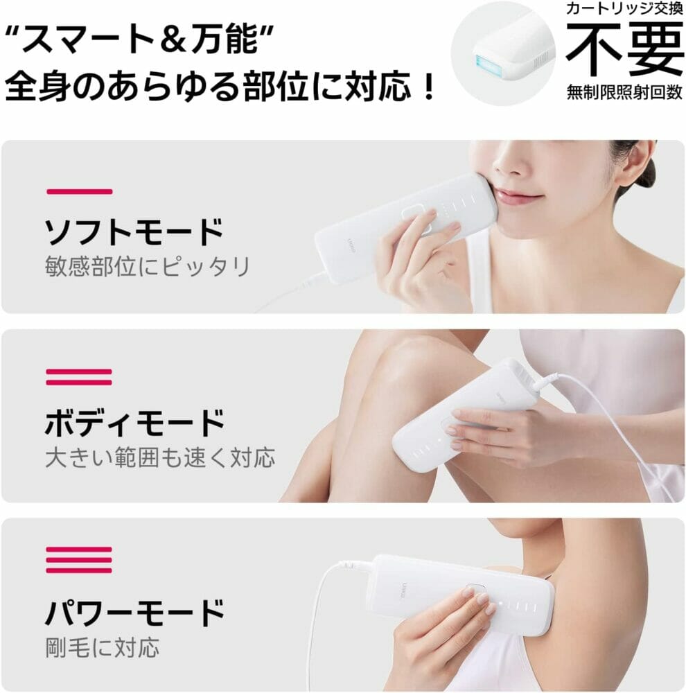 腕、太もも、背中など照射場所ごとに最適な自動モードを選択可能。カートリッジ交換も不要で、照射回数上限を気にすることなく使い続けられます。