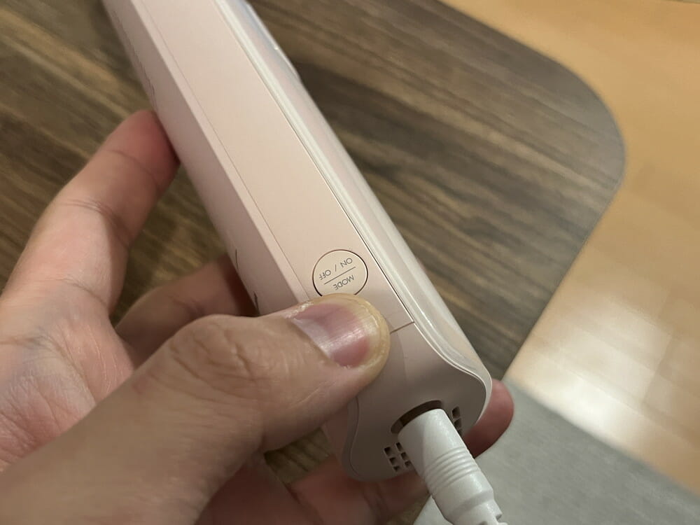 そして電源ボタン/モード調整ボタンを長押しすると電源がONになり、正面のインジケーターが点灯します。