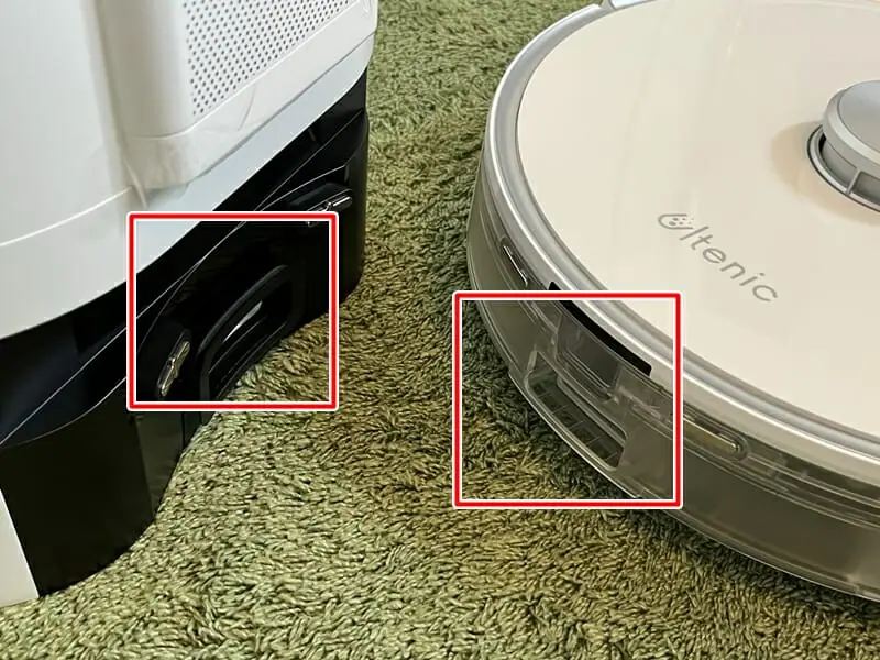 そしてロボット掃除機背面の端子と、ベース底部の端子が接触するようにロボット掃除機を設置する。