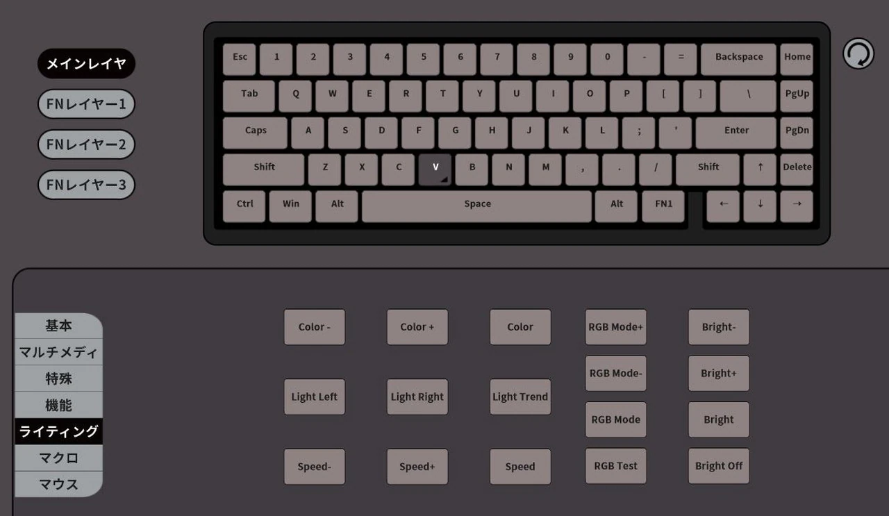 | Fnキー + ← or →キー | RGBライトの点灯速度変更 |