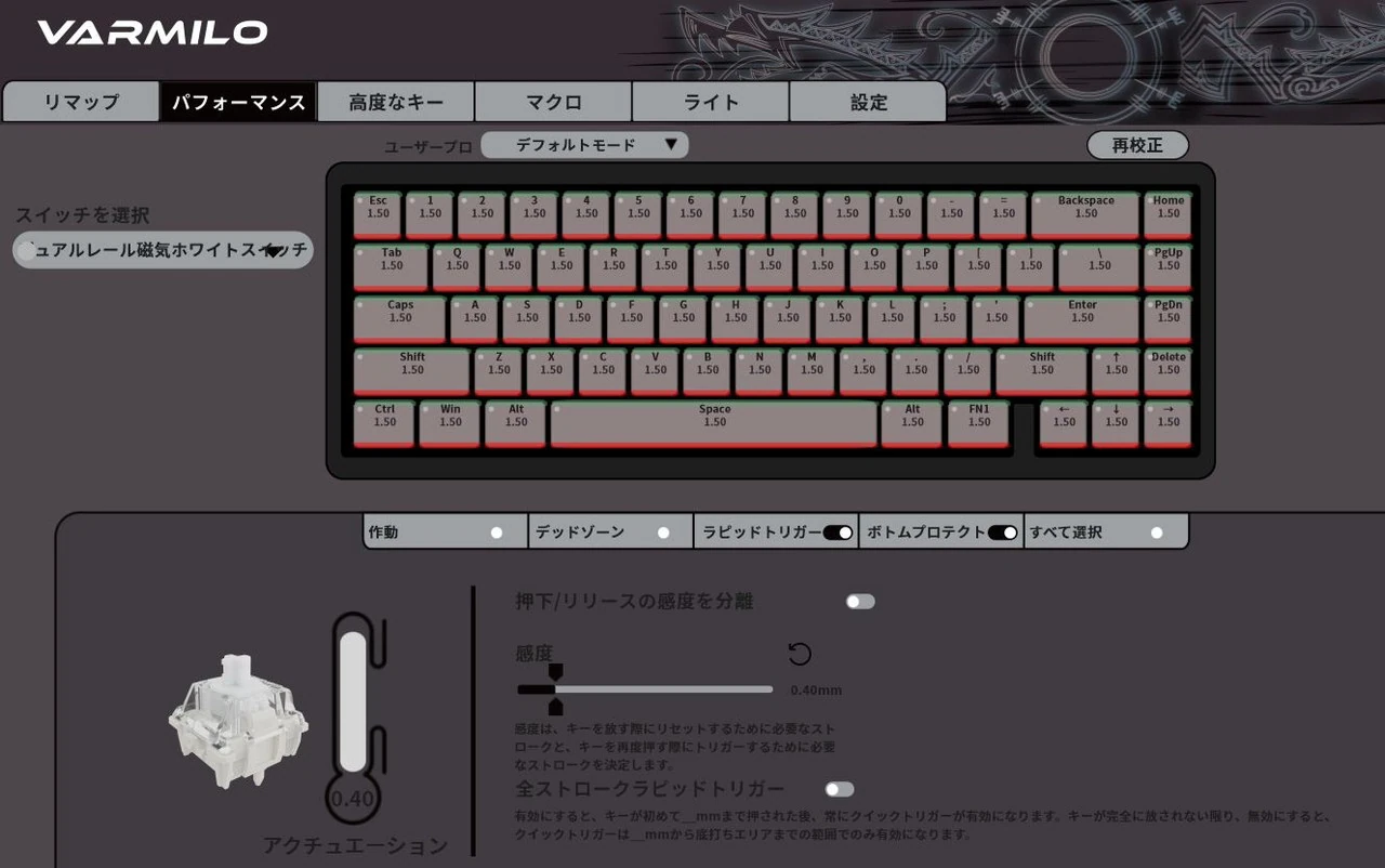 そして公式が配布する専用ツールを使用することで、スイッチのトリガーポイント調整やキーストローク(Dynamic Keystroke)の設定、デッドゾーン調整、RGBバックライトのカスタマイズなど、非常に幅広い調整を行うことが可能となっている。