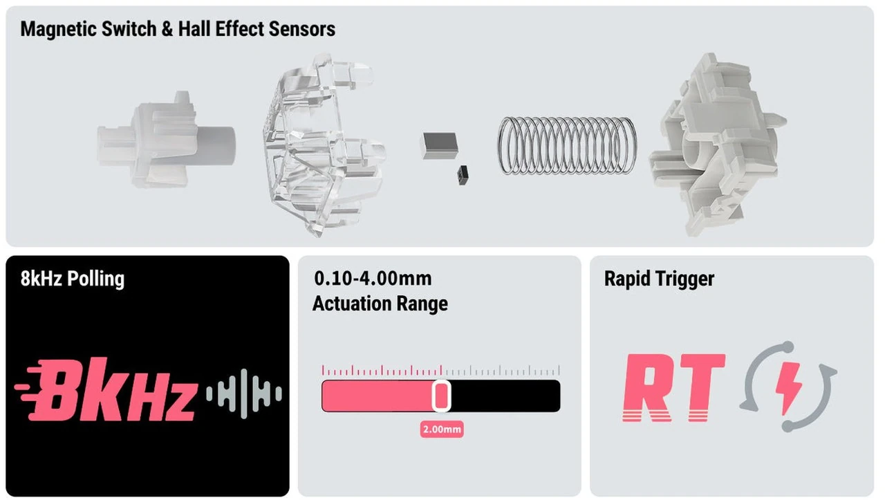 「Magnetic White」と「Magnetic Jade PRO」の2種類のバージョンが用意されており、いずれも0.2msの低遅延で、素早い入力を実現。特にMagnetic Jade PROは高精度認識と高速入力を特長としており、本格的なゲーミングに最適だ。