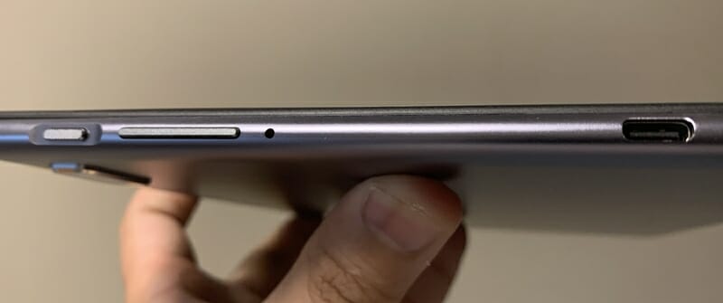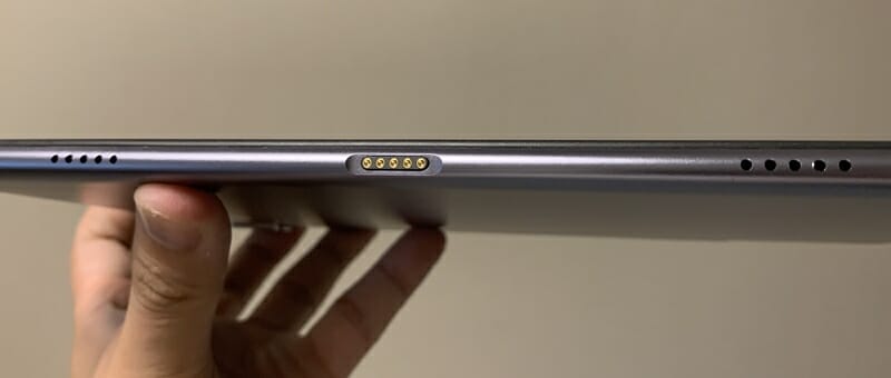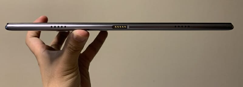 ▼本体左側面には2つのスピーカー穴と、専用キーボードケースと接続するための端子が備え付けられている。