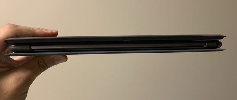 ▼ケースを装着した状態でも、そこまで厚みは増さない。