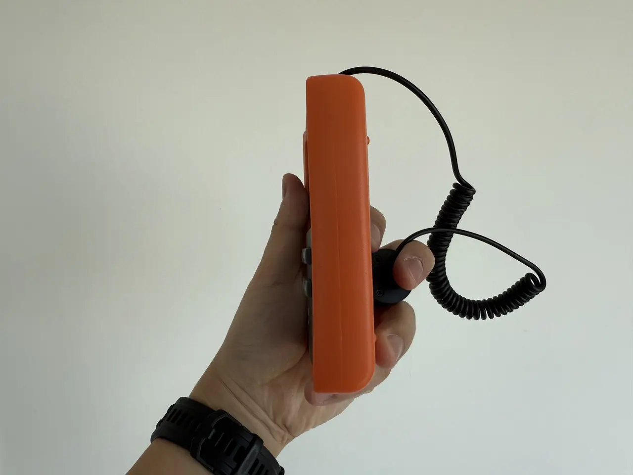 ▼Vici LX1336B本体部分のサイズは125×87×28mm。普段は保護ケース(オレンジ色部分)に入っており、その場合は1cmほど厚みが増す。