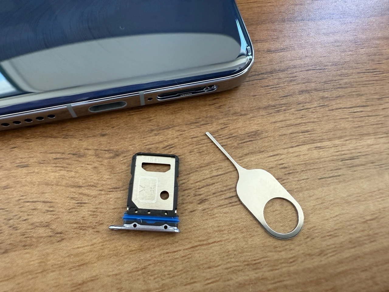 ▼付属のピンでカードスロットを開き、デュアルnanoSIMカードの挿入が可能。マイクロSDカードの挿入には対応していない。