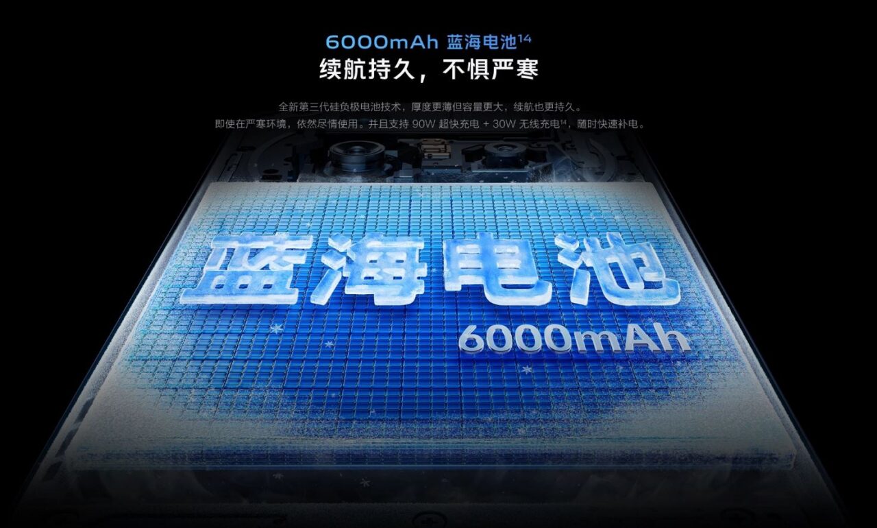 6,000mAhのバッテリーを内蔵。90W有線急速充電・30Wワイヤレス急速充電をサポートしており、わずかな時間であっという間にバッテリー残量を回復できる。
