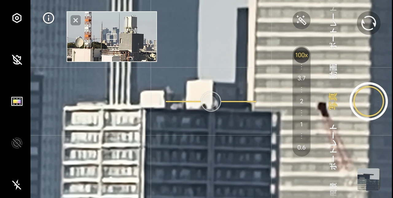 望遠撮影の場合、一般的なスマホであれば10倍望遠撮影時ですら遠景の輪郭がぼやけてしまい、不鮮明な写真しか撮ることができない。