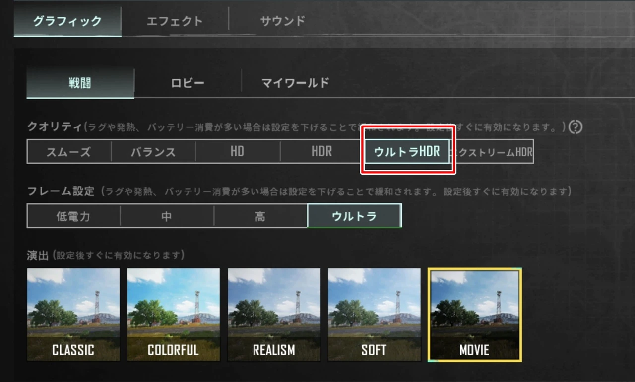 まずグラフィッククオリティに関しては、現時点で最高設定の『ウルトラHDR』を選択できた。