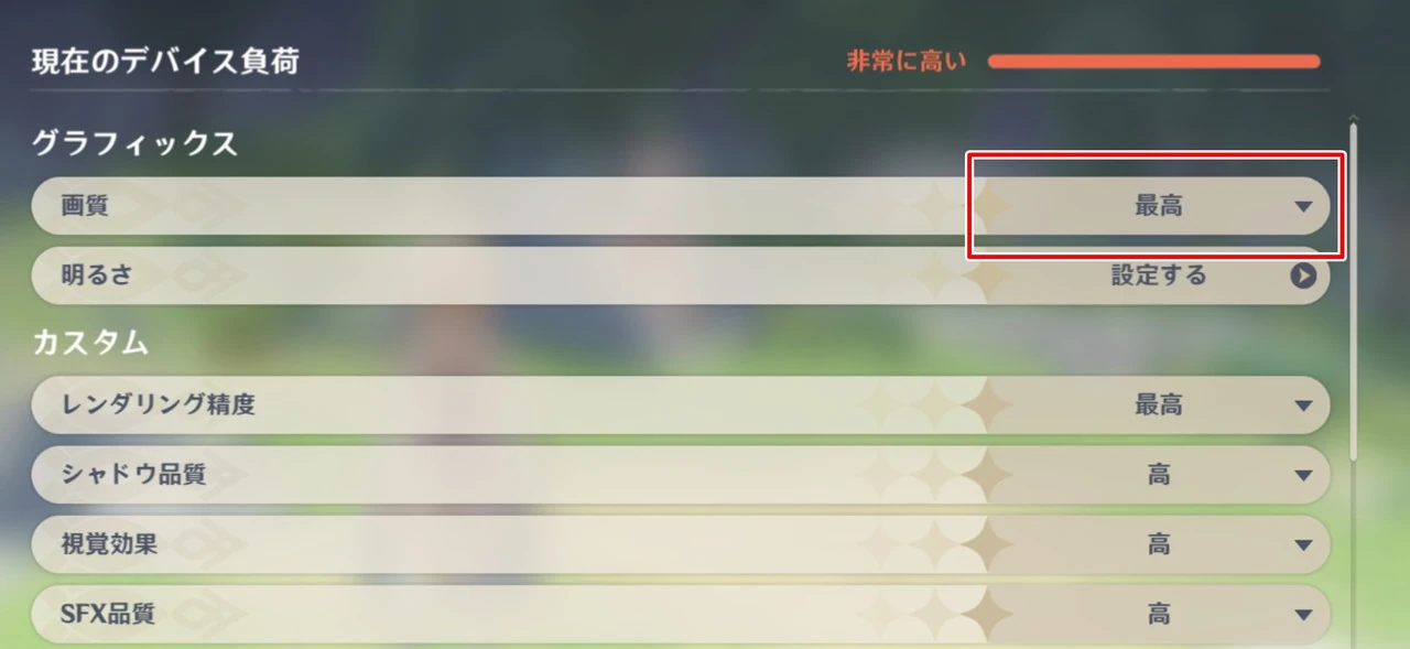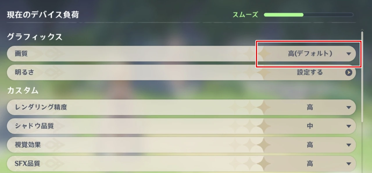 ▼画質設定はデフォルト状態で "高" に設定されており、デバイス負荷は "スムーズ" の状態