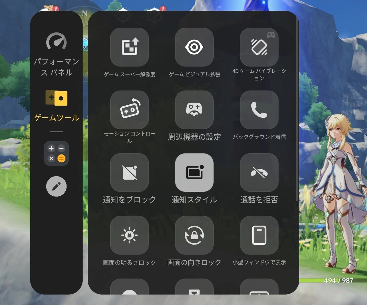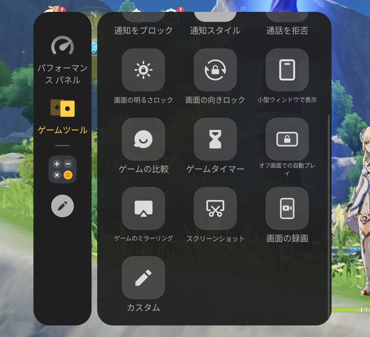 ゲームアプリプレイ時に画面縁をスワイプすると、ゲーミング向けの様々な機能が用意されたウィンドウが出現する。