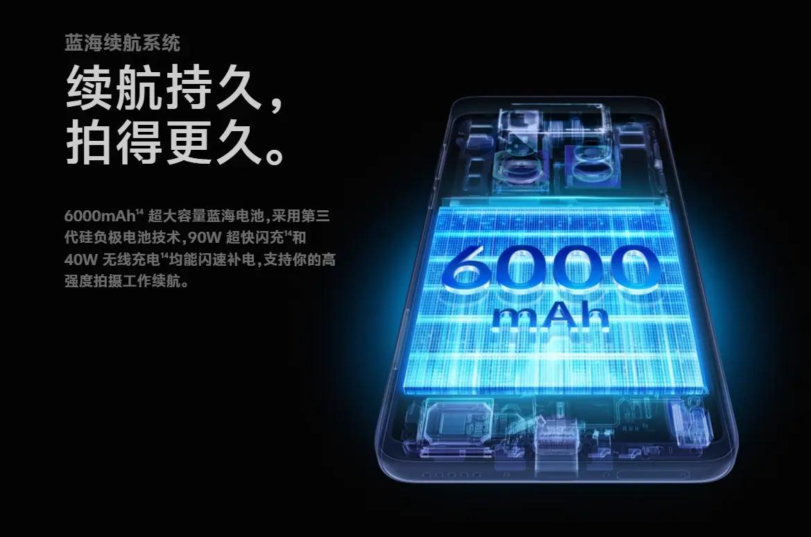 6,000mAhバッテリーを内蔵し、長時間の連続使用が可能。90W有線急速充電、40Wワイヤレス充電をサポートするほか、有線&ワイヤレスによる逆充電にも対応。実用性は抜群です。